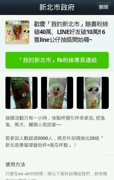 Line越來越多人用了,其中不乏有名人、偶像歌手、企業單位,現在連公家政府機關都有官方帳號了。像我住的新北市日前也開通了新北市政府的Line官方帳號。裏頭有什麼東西呢?使用到目前為止,有發過像是有活動抽獎、市政服務宣導、即時重大訊息、藝文娛樂活動訊息、颱風假何時放等等實用資訊,對於沒時間一一去找的人來說,真的十分便利。