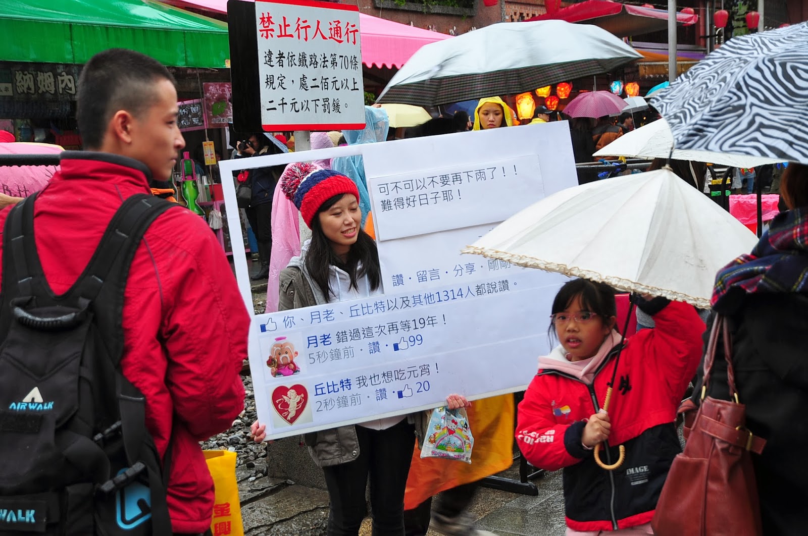 不過可惜這天是下雨天,整個就是很濕濘。不過還是有很多人來平溪玩。當然還有很多愛攝影的人前來,像我就是。還有是衝來放天燈的吧。看下圖還有人自製看板,幫忙你拍拍立得,賺賺情人財(剛好情人節)。